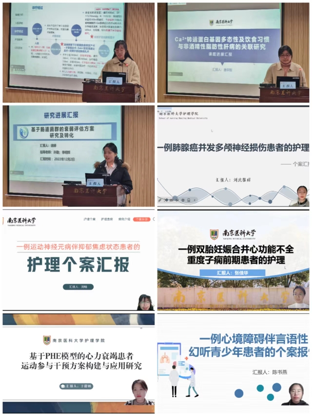 随后,14名汇报人依次汇报,其中专业型硕士研究生汇报临床护理个案,精心准备不同种类疾病的护理方案,并运用科研思维总结反思。学术型硕士研究生汇报课题进展,充分展示近三年的科研成果和后期工作计划。