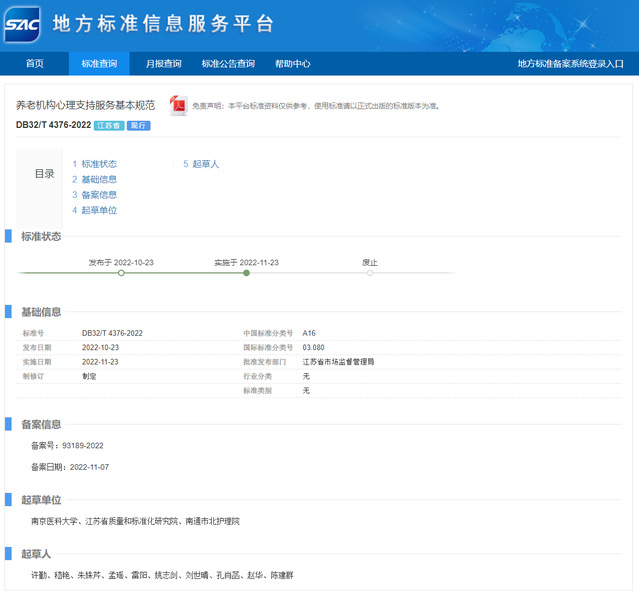 近日,由米兰体育牵头组织编写的江苏省地方标准《养老机构心理支持服务基本规范》(DB32/T 4376-2022)正式发布。