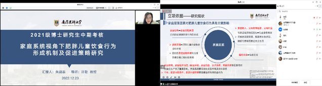 朱涵菲博士汇报了自己的研究课题《家庭系统视角下肥胖儿童饮食行为形成机制及促进策略研究》。对课题选题的研究背景、立项依据、研究目的和内容、研究方法等进行了详细的阐述,并对现阶段已取得的研究结果、下一阶段研究计划、预期成果等进行汇报。专家们首先对朱涵菲博士的课题进展表示充分的肯定,也对课题设计中存在的不足以及后续推进提出了宝贵的意见和建议。学院研究生教育督导嵇艳老师在线督查。