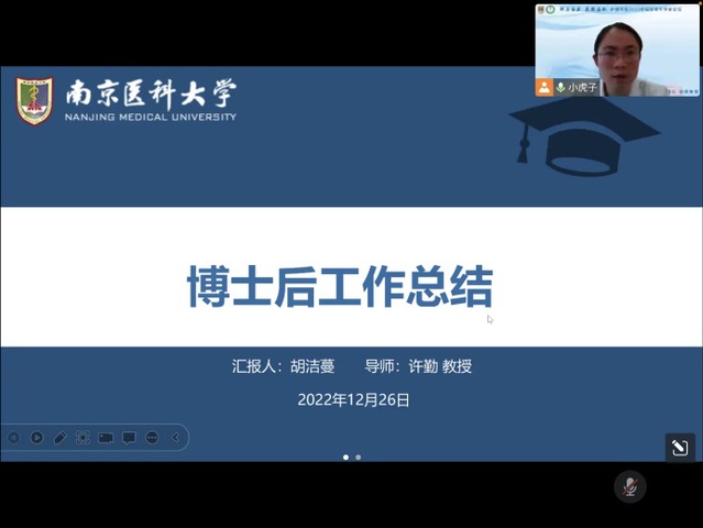 胡洁蔓博士后首先从科研、教学、临床实践、学生管理等方面对其博士后工作内容进行小结。科研上,该博后汇报了其获中国博士后科学基金面上资助的研究课题《基于健康生态学理论的结直肠癌幸存者衰弱变化轨迹探究及临床干预研究》,并针对该课题选题的研究背景、立项依据、研究方法、现阶段已取得的研究结果、下一阶段研究安排及预期成果进行汇报。教学上,该博后展示了其积极参与学院本科生及留学生理论与实践课程教学工作及辅助工作。临床实践上,该博后介绍了其在南京医科大学第一附属医院开展研究期间参与多学科团队合作工作及协助该科室进行的多项课题申报工作。学生管理上,该博后介绍了其作为学院本科生兼职班主任在指导学生学习、科研及身心健康方面开展的教学辅助工作。