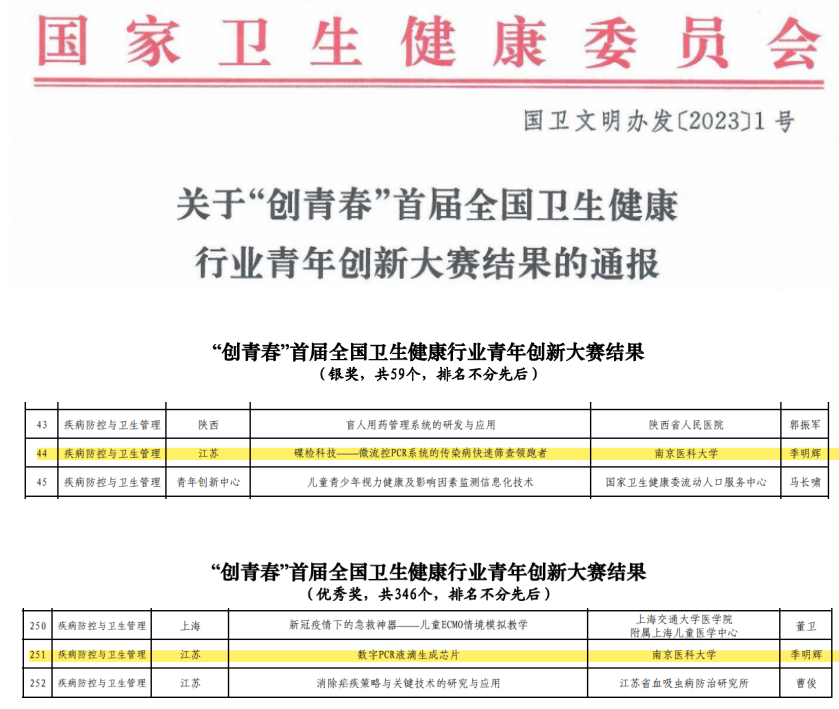 2023年1月11日,由国家卫生健康委文明办、共青团中央青年发展部、中国青年创业就业基金会联合开展“创青春”首届全国卫生健康行业青年创新大赛获奖名单发布,南京医科大学米兰(中国)让运动改变生活季明辉老师领衔指导的《碟检科技——微流控PCR系统的传染病快速筛查领跑者》项目以及《数字PCR液滴生成芯片》项目分别荣获银奖和优秀奖,成绩喜人!