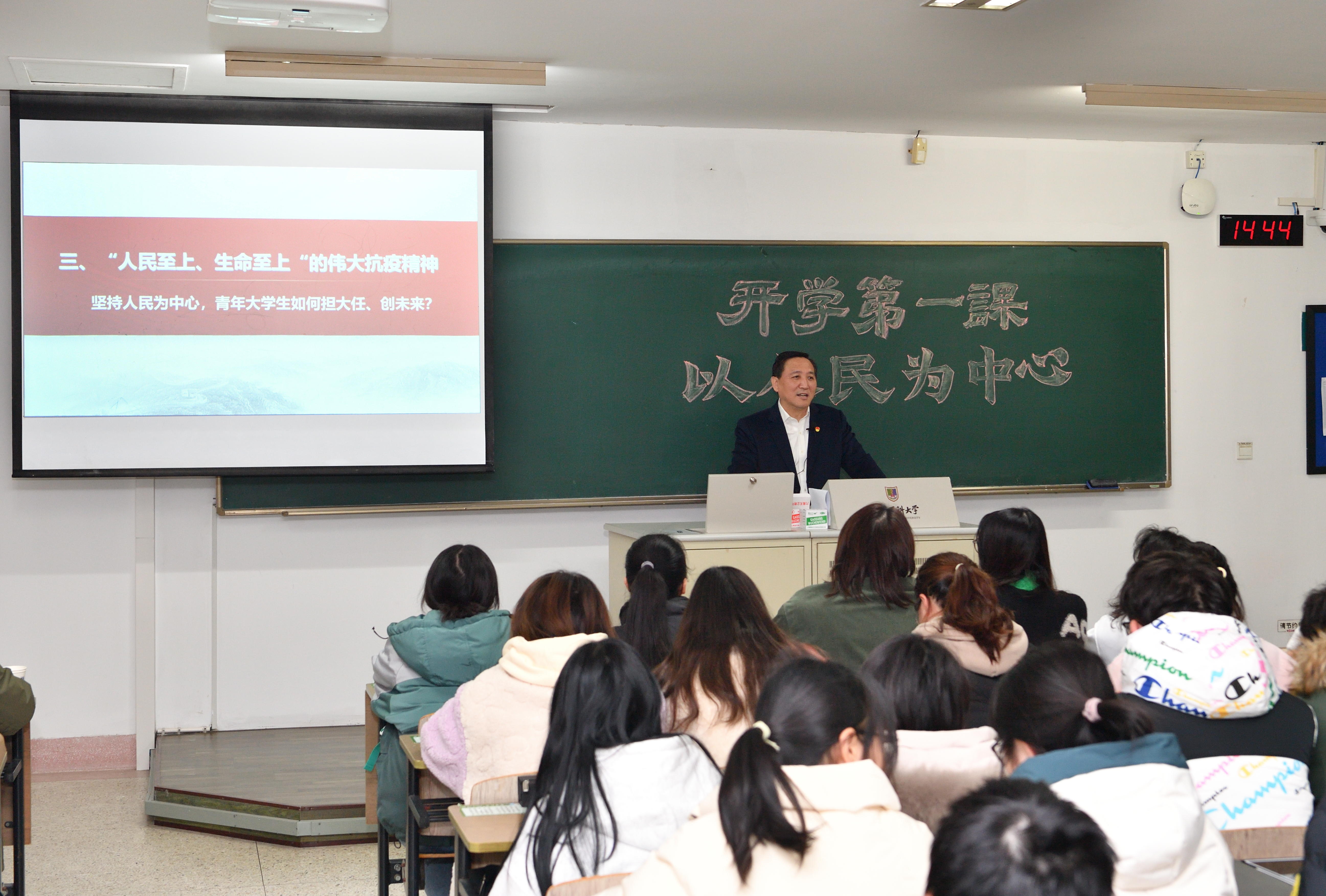 2月22日下午,学校党委书记兰青走进明达楼K311“习近平新时代中国特色社会主义思想概论”课堂,为我院2022级本科生讲授新学期第一堂思想政治理论课。