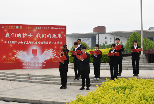 10名学生代表带来的朗诵《砥砺奋进跟党走、青春奋斗新征程》,展现了护理学子听党话、跟党走,昂扬奋进的青春风貌。