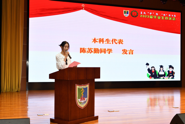 本科生代表陈苏勤在毕业感言中,感恩学校可敬可爱的老师、感恩同行路上的伙伴,一生扣好“博学至精、明德至善”的扣子。
