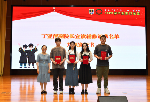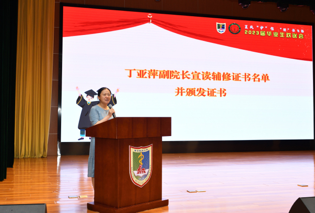 表彰环节中,丁亚萍副院长宣读辅修证书名单并颁发证书。