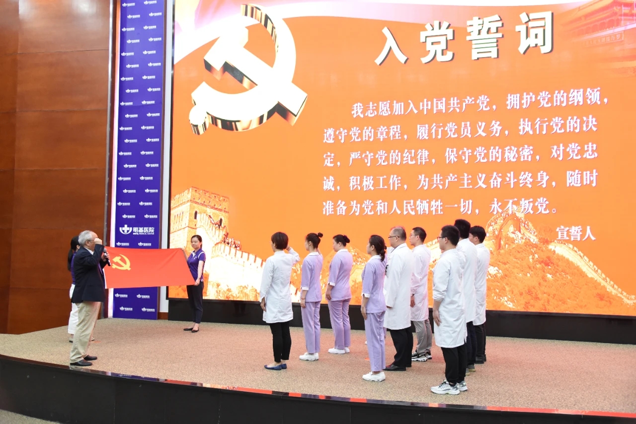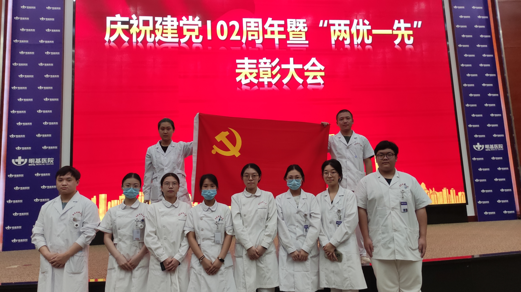 同一天下午,我院2020级全体实习生在老师的带领下参加了南京医科大学附属明基医院在第一国际会议厅召开的“庆祝建党102周年暨‘两优一先’表彰大会”,会议中,两位“两优一先”获奖代表围绕发挥党员模范作等方面、结合自身工作实际进行了分享交流,实习生们纷纷表示感悟良多。