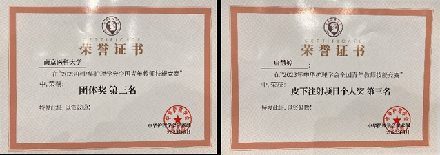 我院教师唐慧婷、唐楚蕾、附属逸夫医院肿瘤科护士长刘佳组成参赛队,丁亚萍副院长任领队,董玲副教授、嵇艳副教授任指导老师,第一附属医院、附属逸夫医院组织临床护理骨干担任竞赛指导专家。开幕式上,唐慧婷老师代表参赛选手进行宣誓。经过激烈紧张的比赛,我院代表队在大赛中获得团体第三名,唐慧婷老师获得皮下注射操作单项第三名。