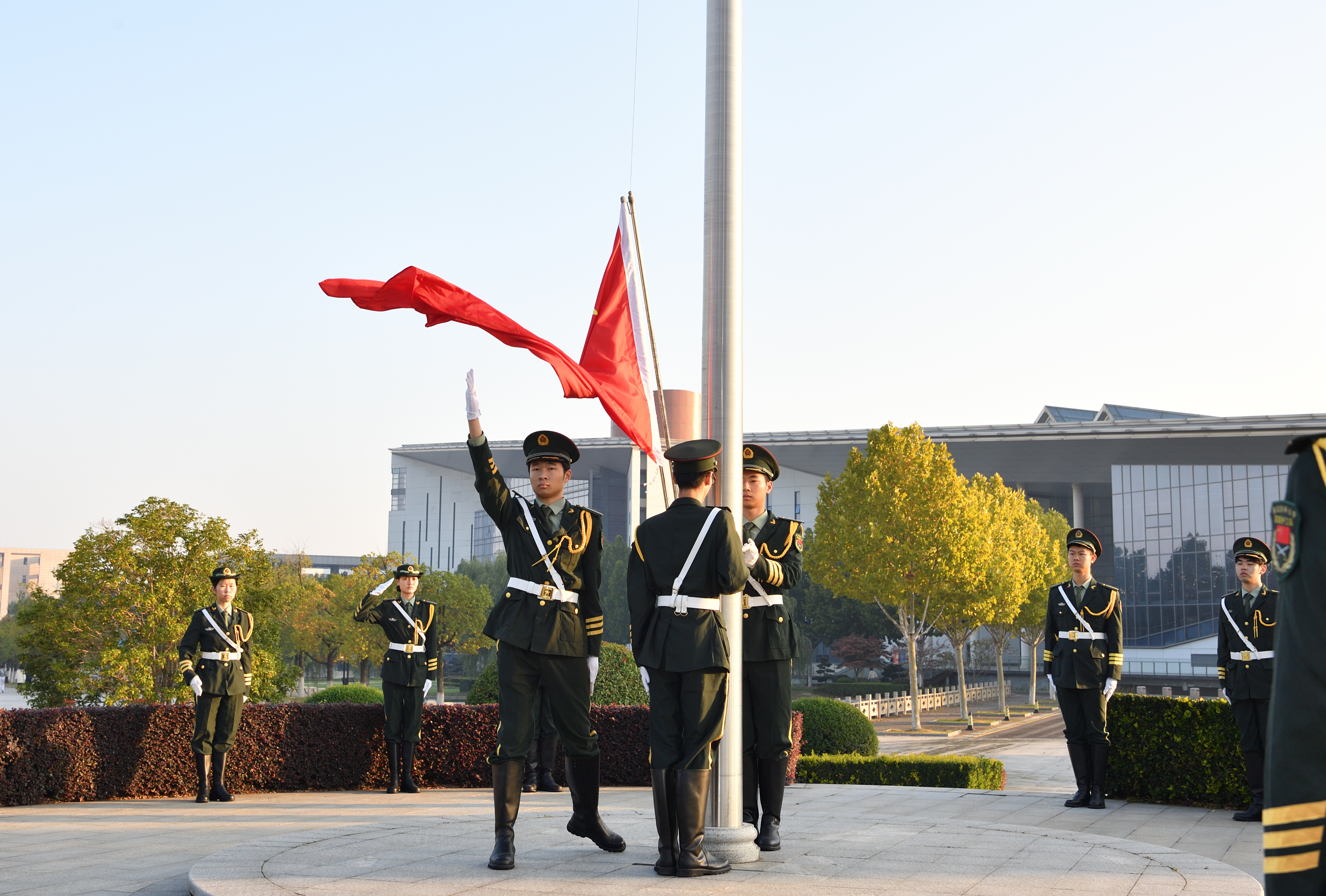迎着清晨的朝阳,伴随着雄壮激昂的国歌,鲜艳的五星红旗冉冉升起。