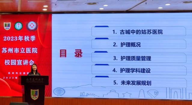 11月5日,南京医科大学附属苏州医院在我校开展校园招聘“直通车”人才招聘计划,南京医科大学附属苏州医院护理部蒋玲主任展开宣讲,主要从苏州风貌、医院概况、护理概况、护理质量管理、护理学科建设、未来发展规划等方面进行介绍。她通过问答环节向同学们详细介绍了本次校园招聘“直通车”优惠政策,吸引了众多同学积极报名。经过面试考核,附属苏州医院一次性录用我院76名毕业生。
