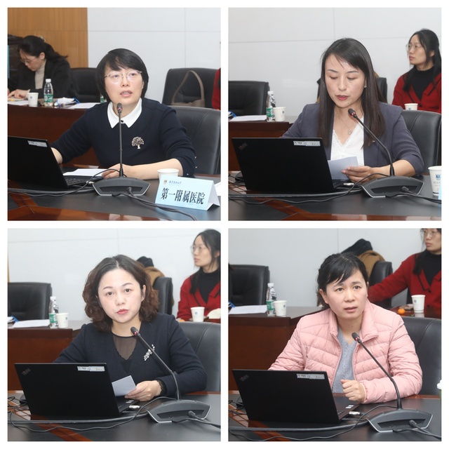 四位护理部主任代表教学基地汇报工作。第一附属医院李方主任、附属苏州医院蒋玲主任、附属肿瘤医院张柳柳主任、新街口社区卫生服务中心侯彩云主任先后围绕组织融合、师资共建、人才培养、教学融合、科研联动、对外交流、资源共享等方面总结了校院融合的具体举措及取得的成效。