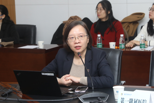 四位护理部主任代表教学基地汇报工作。第一附属医院李方主任、附属苏州医院蒋玲主任、附属肿瘤医院张柳柳主任、新街口社区卫生服务中心侯彩云主任先后围绕组织融合、师资共建、人才培养、教学融合、科研联动、对外交流、资源共享等方面总结了校院融合的具体举措及取得的成效。