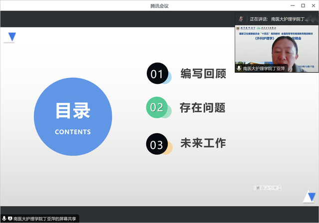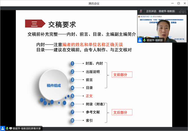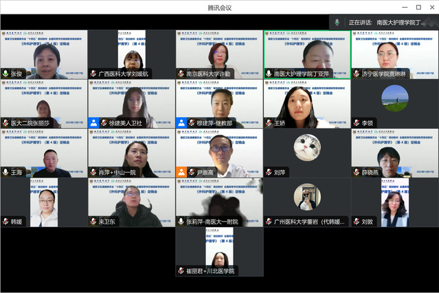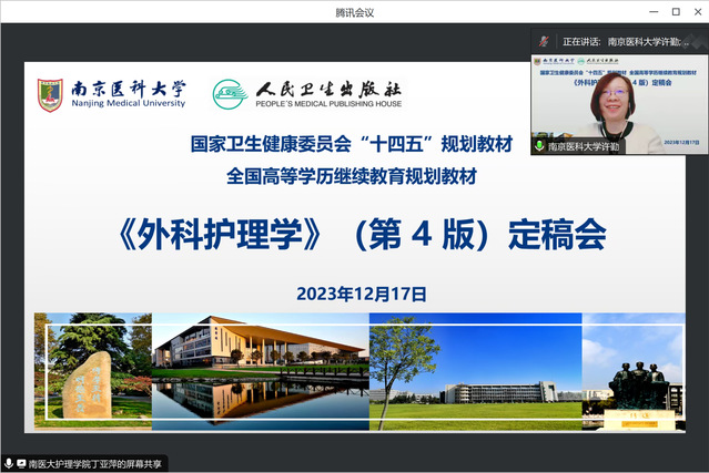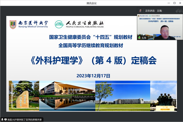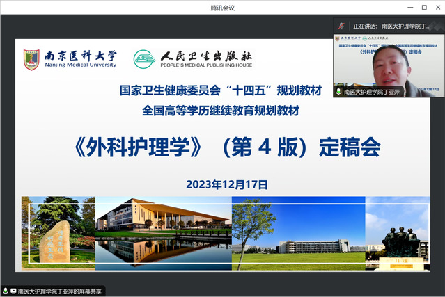 2023年12月17日,由南京医科大学护理学院丁亚萍副院长和山东第二医科大学米兰(中国)让运动改变生活尹崇高副院长共同担任主编,人民卫生出版社国家卫生健康委员会“十四五”规划教材、全国高等学历继续教育规划教材《外科护理学(第4版)》定稿会在线顺利召开。人民卫生出版社穆建萍编辑、徐建美编辑,南京医科大学继续教育学院王海院长,米兰(中国)让运动改变生活许勤院长,以及来自全国18所医学院校的20名编委参加会议。会议由丁亚萍主编主持。