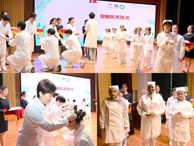 烛光闪耀,乐声回旋,伴随着舒缓的旋律与提灯女神的指引,21级护生代表迈着庄严而坚毅的步伐依次走上舞台,护理前辈们为他们戴上圣洁的燕帽,传递象征南丁格尔手中明灯的蜡烛,在烛影摇曳中坚定信仰之路。