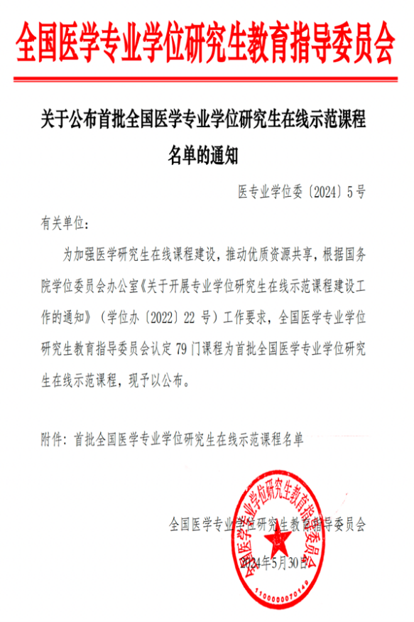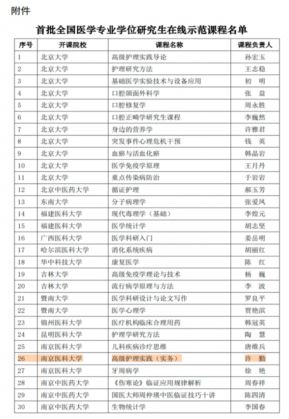5月30日,全国医学专业学位研究生教育指导委员会公布了首批全国医学专业学位研究生在线示范课程名单,本次认定79门课程,我院《高级护理实践(实务)》成功入选。