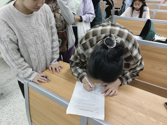 在会后,各班进行诚信承诺签订活动,“分数诚可贵,诚信价更高”,要严格遵守考场纪律、实事求是,杜绝任何形式的作弊行为,把道德原则和道德规范化为自己的内心信念和实际行动,让舞弊远离考场,让诚信常驻心中。