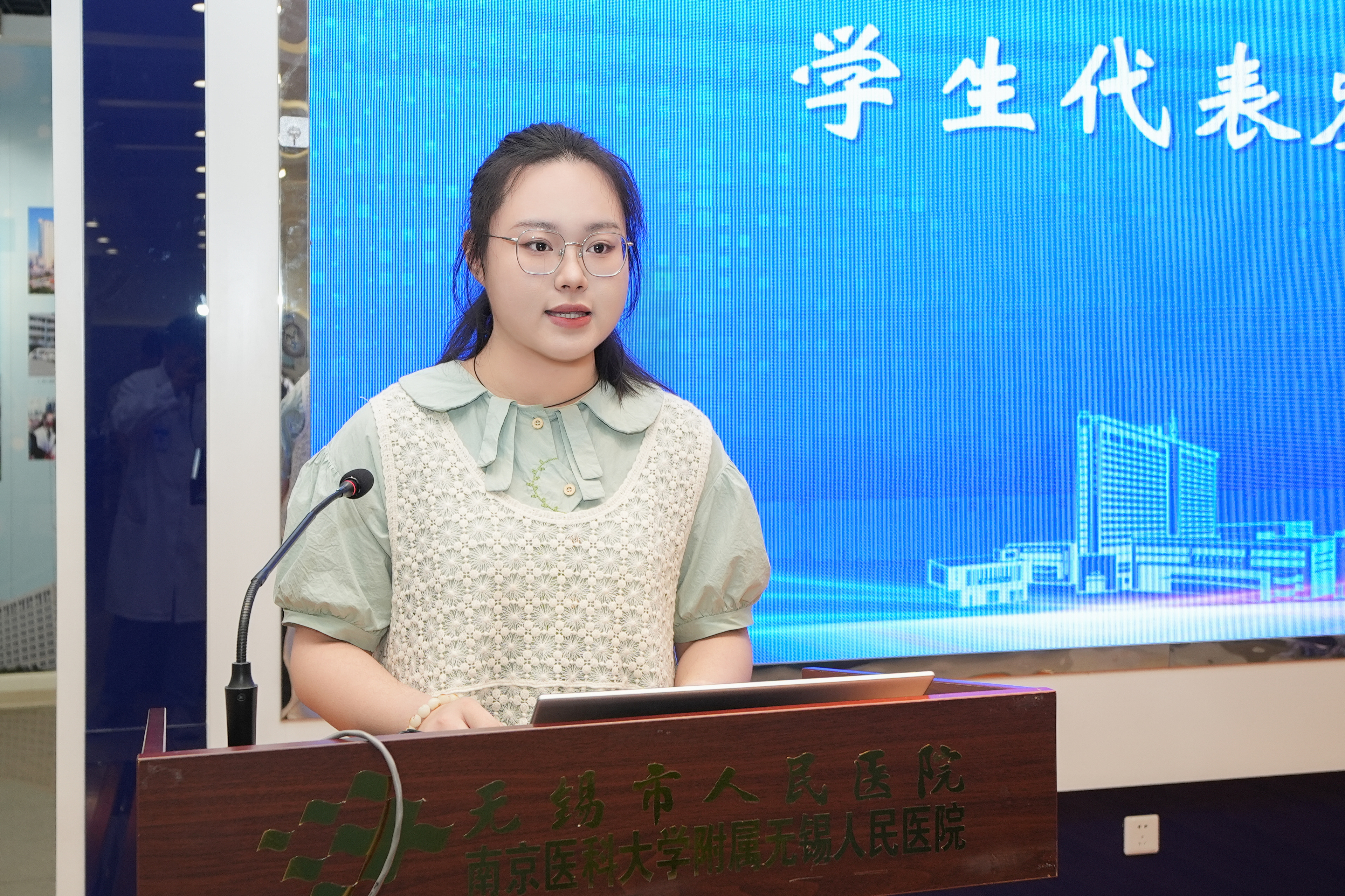 学生代表谭斐翔发言。她感谢老师们的辛勤付出,同学们会在未来的道路上不断前行,以仁爱之心,守护百姓健康。