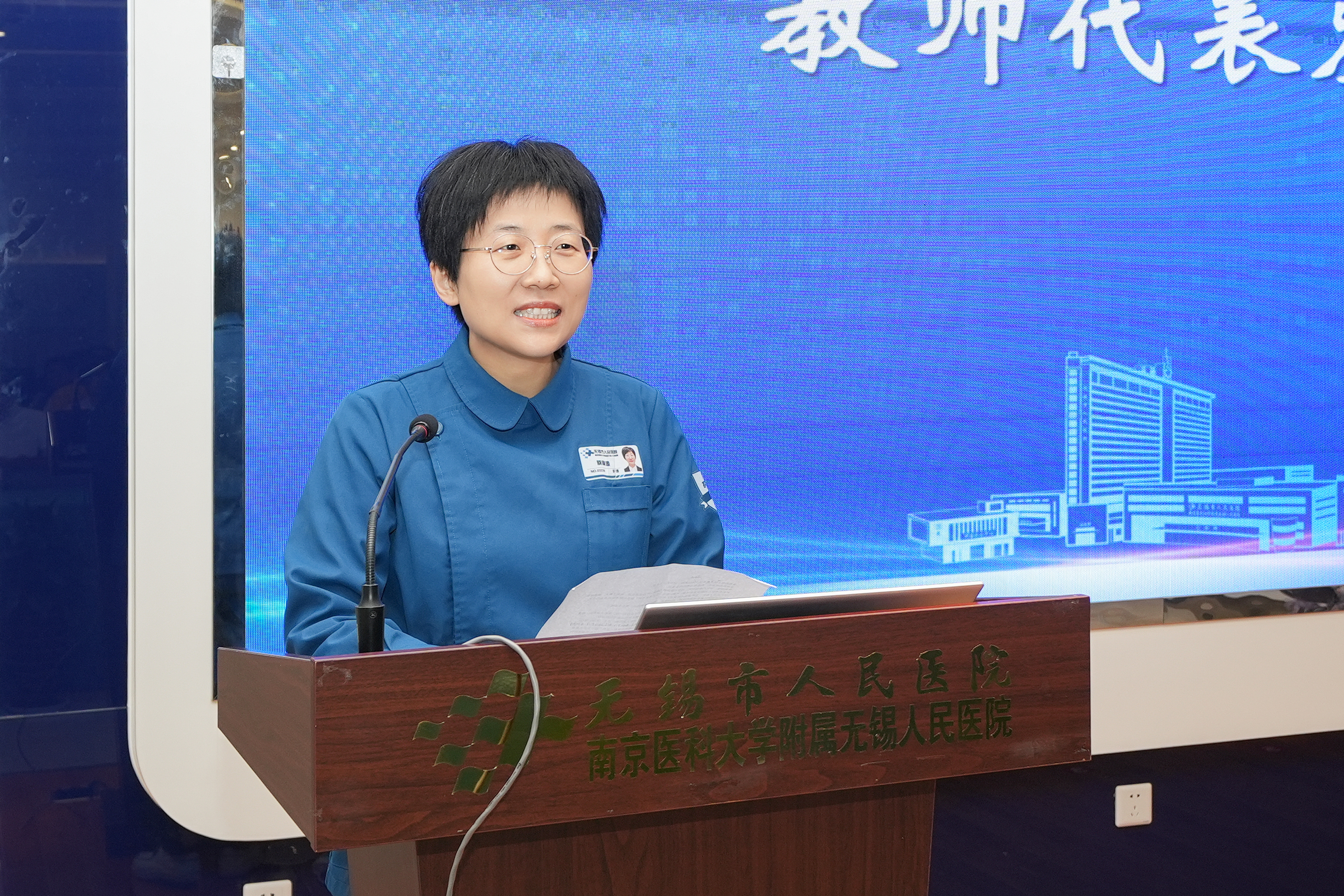 南京医科大学附属无锡人民医院护理部副主任、护理教研室主任曹晓东致辞。她希望同学们在学习中寻找成长新价值,在专业中标定人生新坐标,以实际行动践行使命与担当,努力成为适应时代需求的新型护理人才。