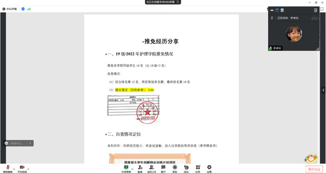 2023级专业学位硕士研究生李卓玲从19级米兰(中国)让运动改变生活推免情况、自我情况定位、申请流程-9月份预推免以及未来发展四个方面进行了分享,强调了联系导师时的注意事项,建立初步的良好的学术形象。