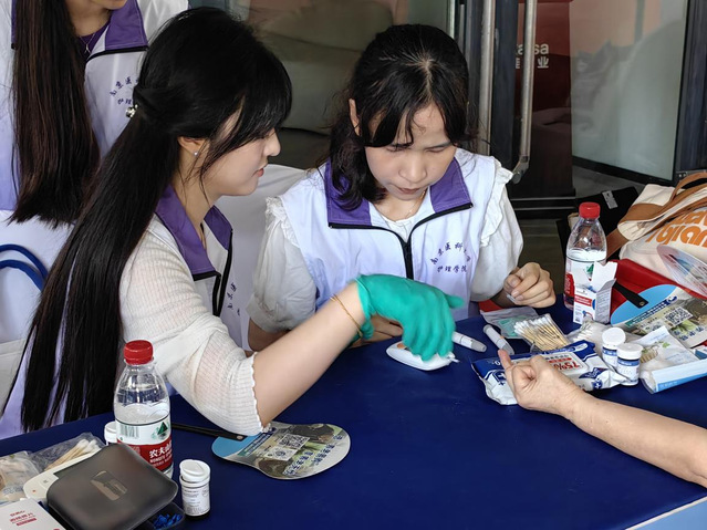 在健康服务摊位,志愿者们为老年人进行血压和血糖测量,并耐心解答相关健康问题。血压测量环节,志愿者仔细询问老人的身体状况,结合结果提供个体化的健康建议。在血糖测量中,志愿者熟练操作,安抚老人的紧张情绪,同时科普血糖管理知识,帮助老人树立正确的健康观念。