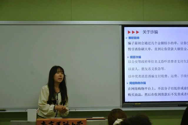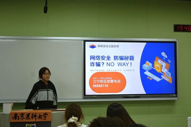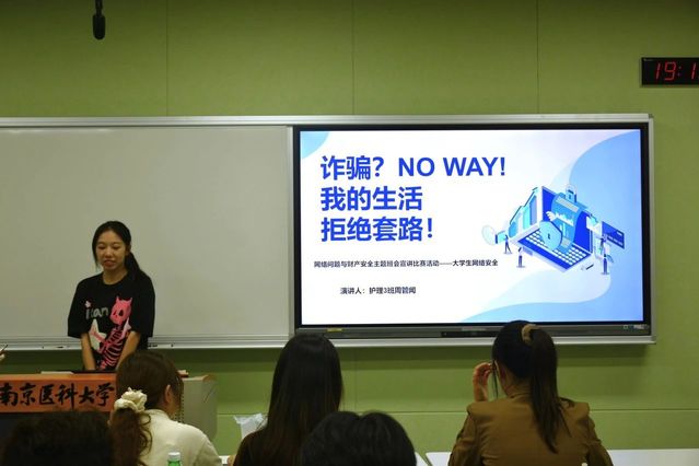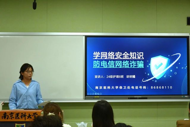 护理1班的张梓桐同学从网络暴力与网络成瘾的表现、影响与解决方法三个方面出发,激情澎湃地为同学们普及了网络诈骗相关知识。