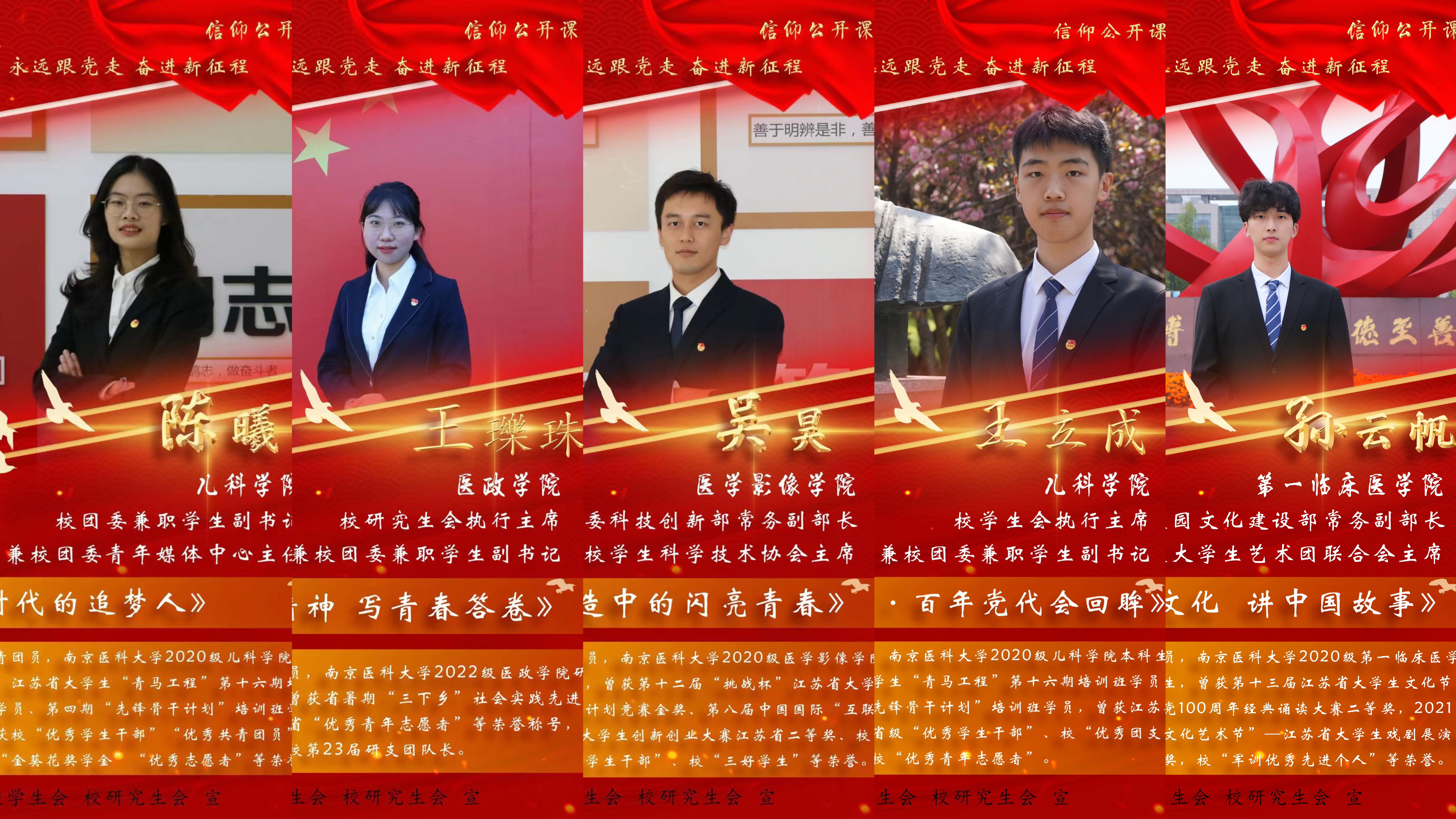 以宣讲内容为核心做延展宣传,最大化撬动宣传资源联动,拓宽宣传渠道,丰富传播形式,挖掘宣传深度。除线上信仰公开课的传播形式之外,以本次信仰公开课为内容核心的宣讲活动类型丰富多样。其中,儿科学院2020级本科生陈曦分别在2022年秋季“青马工程”领航强基培训班开班仪式及基础医学院“学习二十大,奋进新征程”升旗仪式暨“国旗在我心中”主题教育活动中进行《新时代的追梦人》理论宣讲;第一临床医学院2021级本科生谢昕宜在米兰(中国)让运动改变生活“热学热议二十大”之“育才兴邦”主题圆桌会议上围绕作品《信仰点燃青春之梦》做主题发言;医学影像学院2020级本科生吴昊携作品《创新创造中的闪亮青春》参与“奋进新征程,青春勇担当”江苏省大学生演讲比赛,从全省110多件作品中脱颖而出,进入前20名,通过现场直播的方式线上参与决赛,最终排名全省第5,荣获省级二等奖。