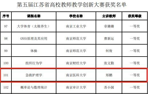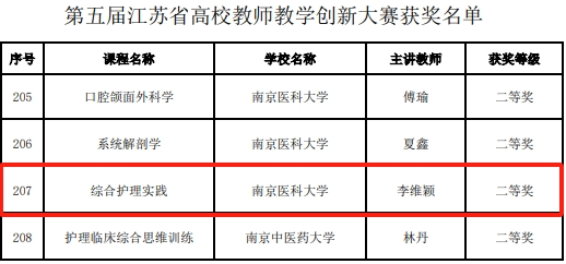 近日,第五届江苏省高校教师教学创新大赛评审结果揭晓,郑鹏老师(课程《急救护理学》荣获等奖,李维颖老师(课程《综合护理实践》荣获二等奖此次大赛全省共有79所高校610项作品参赛,竞争激烈,两位老师在众多参赛选手中脱颖而出,取得佳绩