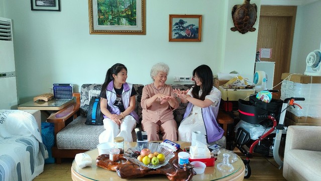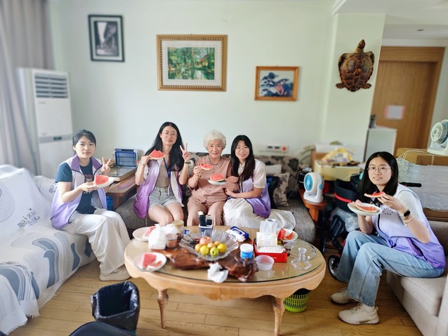 实践的温度在点滴互动中升华。志愿者们叩响长者的房门,开启温馨拜访。“瓜甜语亲”时光里,长者亲手切开的西瓜瓤红汁甜,与志愿者们交流着“甜滋滋”、“凉阴阴”的夏日感受,笑语晏晏间,甘甜驱散了酷暑。在“净手传情”时刻,志愿者们示范标准的七步洗手法,将健康习惯的种子播撒心田。长者餐厅里,欢声笑语定格成“颐乐同堂”的珍贵合影,镜头记录下彼此灿烂的笑容,也凝固了这段跨越代际的深厚情谊。数日间,多位长者在吴语的亲切氛围中积极参与,其投入的神情与反馈的喜悦,成为活动成效最生动的注脚。