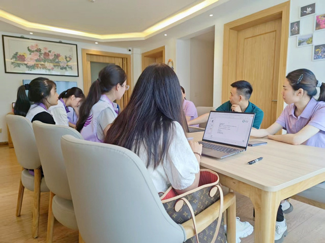 抵达伊始,志愿的暖流便与瑞颐康养的关怀无缝交融。花铖副院长与师生们展开高效对接。从讲座场地的精妙布局,到后续环节的无缝衔接,每一个细节都在反复推敲中凝结着用心。随后,花副院长亲自担任向导,引领志愿者们穿行于社区的温暖空间。窗明几净的活动室流淌着欢声笑语,温馨雅致的居室安放着岁月静好,设施齐备的医疗站传递着安心守护,绿意葱茏的户外花园舒展着生命活力——每一处景致,都无声诉说着瑞颐康养对长者们无微不至的关怀。