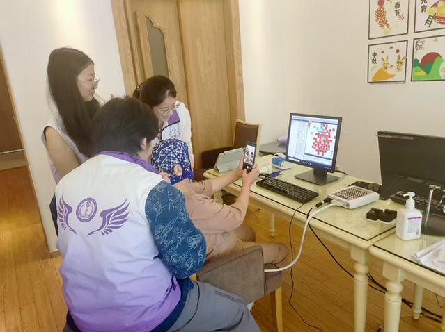 实践的画卷在认知筛查中徐徐铺展,内容精彩纷呈。在“智趣探秘站”的问卷评估环节,志愿者们俯身低语,用亲切的苏州方言将专业题目化作生活化的问答,耐心讲解,细心记录。尤其是作为认知功能“晴雨表”的MoCA测试,得到了长者们的高度理解和积极配合。而在“脑波奇航”的脑电测试体验中,志愿者们轻柔地为长者佩戴专业设备,屏幕上实时显示的脑电波信号,如同探索长者大脑活力的一扇窗口。新奇感点燃了长者的热情,他们饶有兴致地体验着科技带来的认知探索之旅。