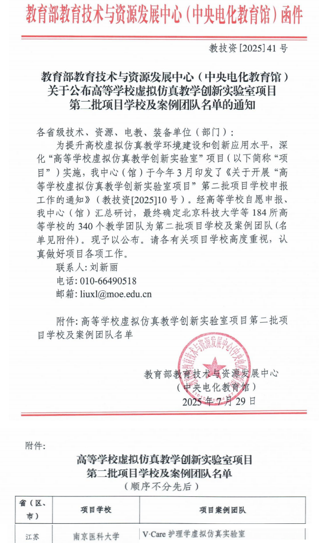 729日,教育部教育技术与资源发展中心(中央电化教育馆)公布《高等学校虚拟仿真教学创新实验室项目第二批项目学校及案例团队名单》(教技资[2025]41号),我院许勤教授主持申报V·Care护理学虚拟仿真实验室成功入选。