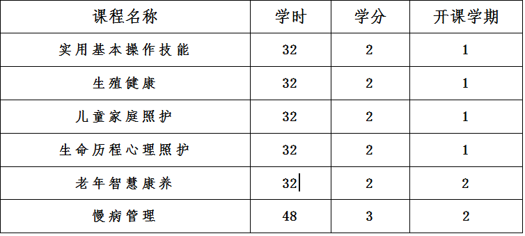 6门课程,共13个学分:《实用基本操作技能》《生殖健康》《儿童家庭照护》《慢病管理》《老年智慧康养》《生命历程心理照护》。