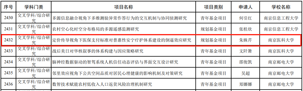 近日,教育部社科司公布2025年度教育部人文社会科学研究一般项目评审结果,我院朱姝芹教授主持的《定价传导视角下医保支付标准对普惠性安宁疗护体系建设的倒逼效应研究》与杨如美主任主持的《老年友好型社会视角下老年人跌倒风险人机协同治理研究》成功获批立项并资助,标志着我院在人文社科研究领域再度实现重要突破。